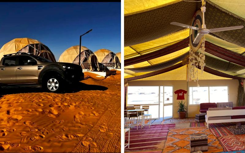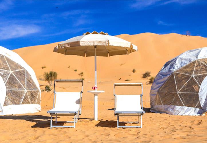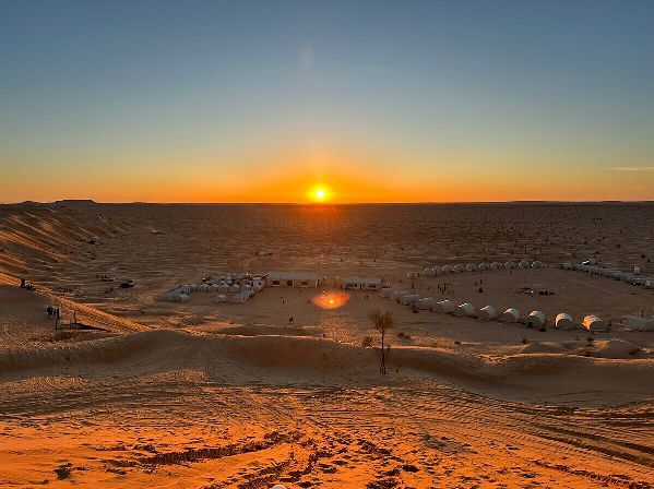 Le camp de Tiniri estun campement de luxe dans le désert du Sahara tunisien, près de Douz, offrant un mélange de style bédouin et de confort moderne avec des tentes spacieuses (nomades, en toile, dômes de luxe) pour de vastes expériences dans le désert, des repas et des activités comme des promenades à dos de chameau et des excursions en 4x4, en mettant l'accent sur la beauté sereine, les nuits étoilées et l'hospitalité authentique du désert.
